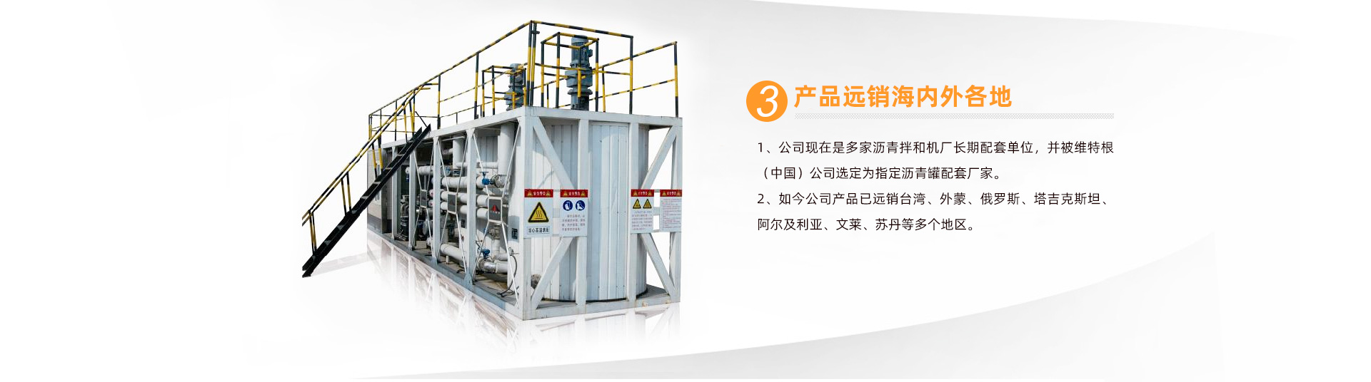經(jīng)多年的努力,在行業(yè)內(nèi)已具有知名度及品牌影響力,獲得多家業(yè)內(nèi)企業(yè)的認(rèn)可,公司現(xiàn)在是多家瀝青拌和機廠長期配套單位,并被維特根(中國)公司選定為指定瀝青罐配套廠家。如今公司產(chǎn)品已遠(yuǎn)銷臺灣、外蒙、俄羅斯、塔吉克斯坦、阿爾及利亞、文萊、蘇丹等多個地區(qū)。 ...... 【查看詳情】